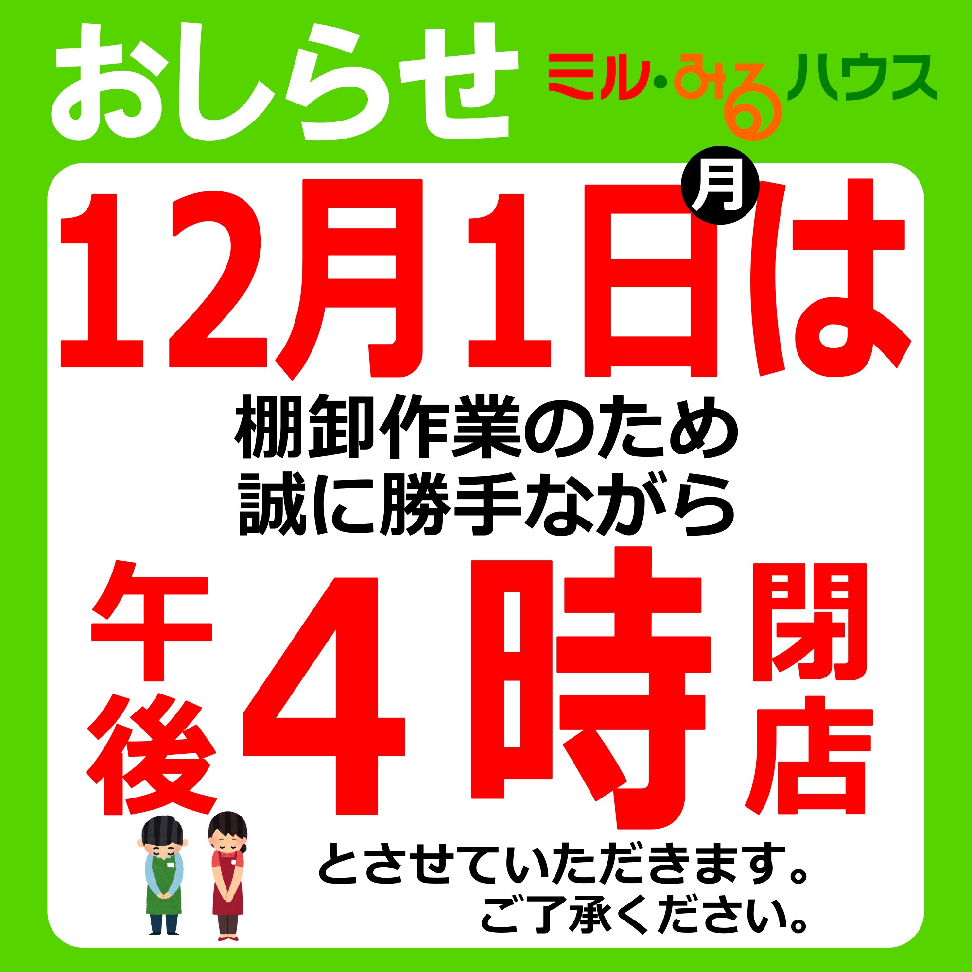 2025.12.1(月)は、棚卸作業のためミル・みるハウスおよび軽米町物産交流館を16時閉店とさせていただきます。