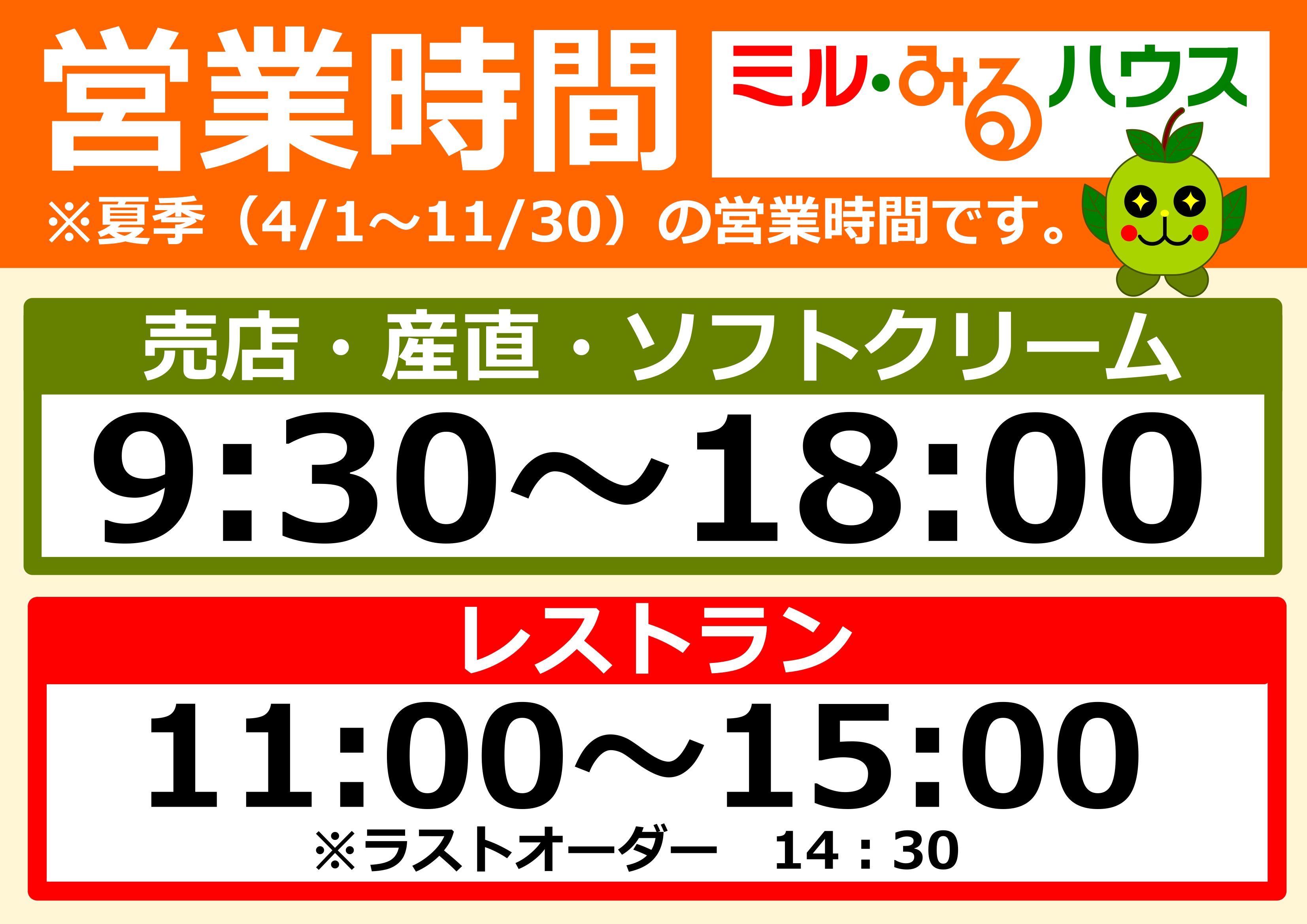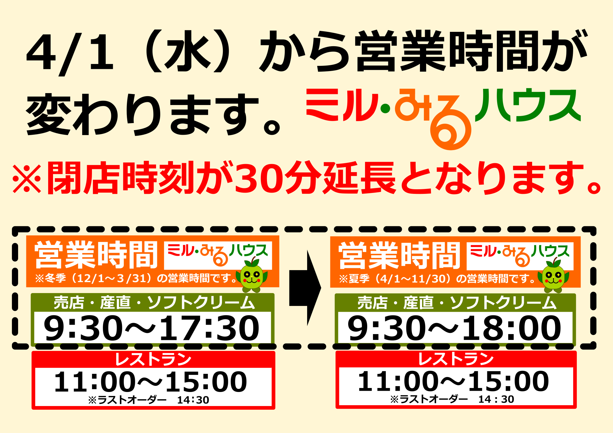 【ミル・みるハウス】営業時間変更のおしらせ(4/1~)